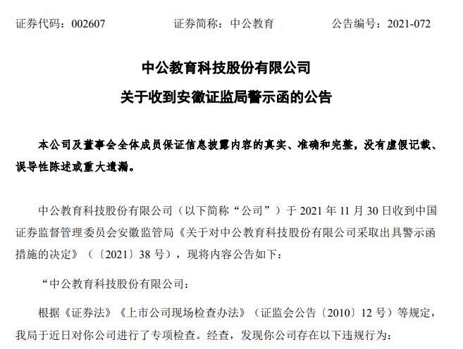 中公教育11月30日公告称,因未按规定履行董事会、股东大会审批程序及信息披露义务,公司收到安徽证监局警示函。
