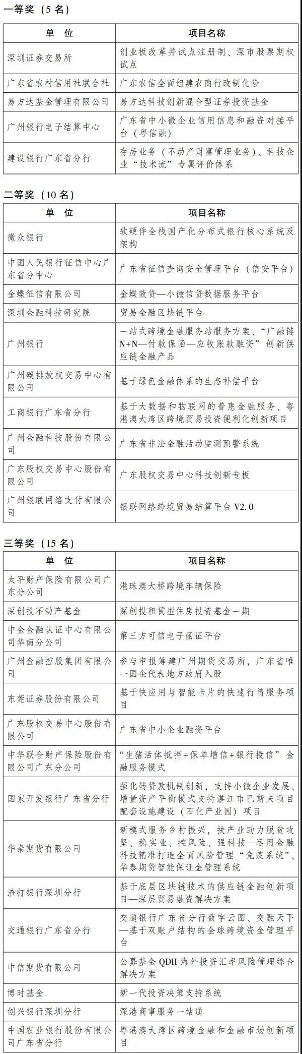 根据《通报》,深圳证券交易所“创业板改革并试点注册制、深市股票期权试点”等5个项目获得一等奖,微众银行“软硬件全栈国产化分布式银行核心系统及架构”等10个项目获得二等奖,广东股权交易中心股份有限公司“广东省中小企业融资平台”等15个项目获得三等奖。