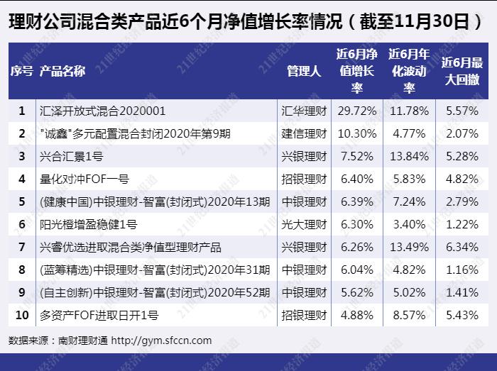 一、南财理财通【理财风云榜】理财公司混合类产品近6月净值增长率榜单