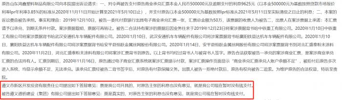 据贵州省遵义市红花岗区人民法院出具的案号(2021)黔0302民初9727号民事判决书显示,因一笔50万元商业承兑汇票逾期,山东鸿鑫塑料制品有限公司(下称“鸿鑫塑料”)将遵义道桥与遵义新开投告上法庭。据悉,该笔商票由遵义道桥委托银行出具,收票人为遵义新开投。汇票到期后,2020年11月16日,鸿鑫塑料通过电子商业汇票系统就案涉汇票提示付款,案涉汇票操作页面显示“商业承兑汇票承兑人账户余额不足”,被拒付后多次进入系统,均显示余额不足,无法承兑。对此,遵义道桥与遵义新开投均在答辩意见中表示“票是真实的,对原告主张的利息也没有意见,就是我公司现在暂时没有钱支付。”