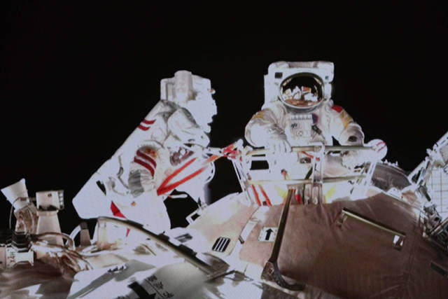 11月8日,在北京航天飞行控制中心拍摄的神舟十三号航天员王亚平(右)结束出舱任务。图源:新华社