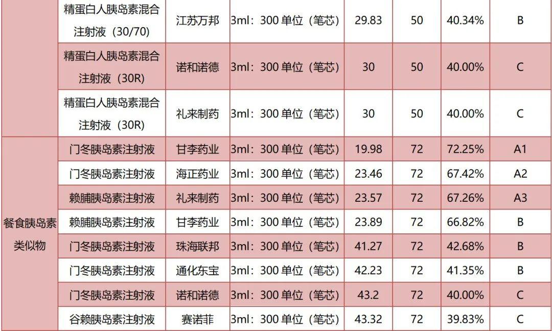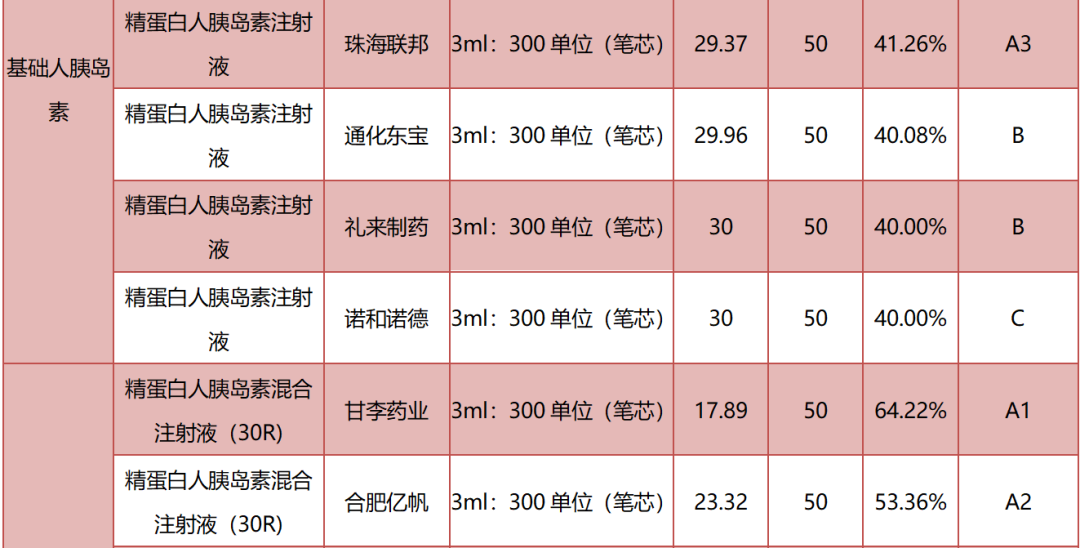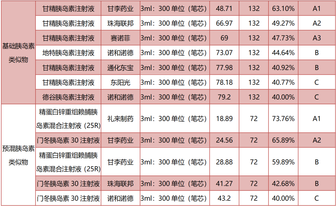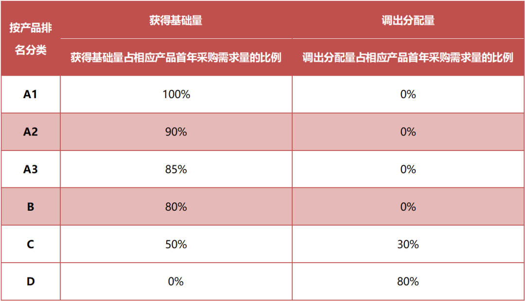 避免断供事件发生,采购量使用基础采购量与调出采购量结合的模式。此前中选产品量分配是按报价的高低进行分配,价格最低的企业可以获得最大的供应量,这就会导致一些新入市的企业为了拓展市场而报出超低价。一旦产能无法迅速扩大,则会引发断供事件发生。本次的胰岛素集采,充分考虑到生物药本身产能扩大较为困难与医院和患者用药习惯的问题,将医院对于具体企业的不同产品进行报量作为企业的基础量。具体来看,每组根据企业报价降幅从高到低分配到A1到D类,降幅越高则获得的基础量的比例和可能的分配量越多(表1)。企业一旦进入C类则会有部分属于自己采购需求量调出分配给其他企业,调出分配量则会根据医院用药选择和企业的产能多重考虑分配给A组企业,在保障价格降低的同时又能使优质企业依然保持一定份额。