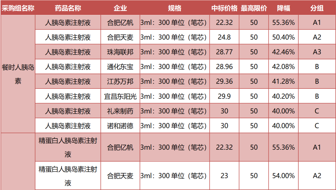 事件:2021年11月26日,第六批国家药品集中采购暨胰岛素专项在上海开标。本次胰岛素集采共纳入二代和三代胰岛素,全年采购量达2.1亿支,约占国内胰岛素一年用量的60%左右。而采购品种则按照二代和三代胰岛素分餐食、基础、预混各三组,共6组进行。最终共有11家企业的42个品种中选,平均降幅48.74%,为历次国采降幅最小。
