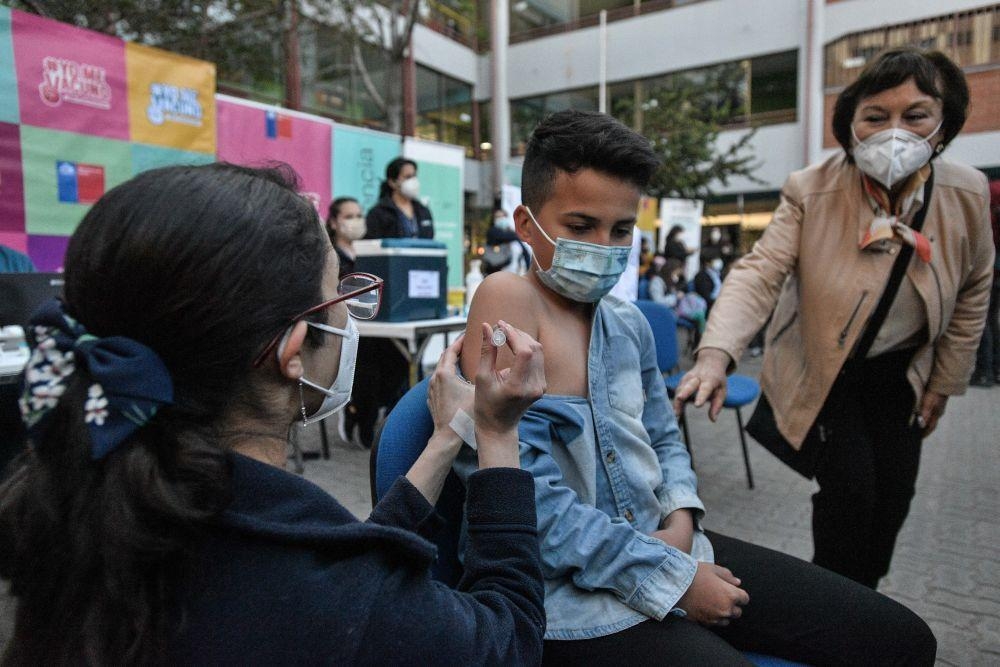 2021年9月27日,一名儿童在智利首都圣地亚哥接种科兴新冠疫苗。27日起,智利开始对6岁至11岁在校学生接种中国科兴疫苗。