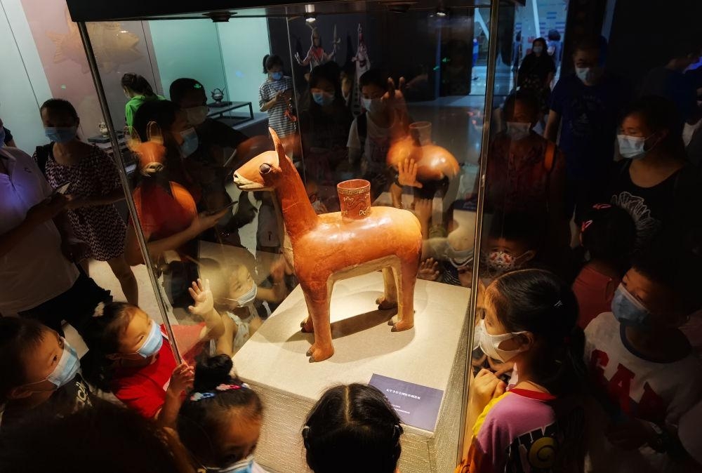 2020年7月4日,游客正在重庆中国三峡博物馆观看“失落的黄金国——安第斯文明特展”。该展以安第斯文明为主线,展出来自秘鲁11家博物馆的近200件套陶器、金器、纺织品等文物。