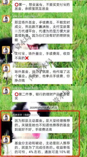 此前,网上流传某家财商教育机构讲师在微信群中讲解主动基金和被动基金的区别时,竟称“主动基金是别人推荐的,就是为了完成任务的。收益率低的可怜,4%左右,通胀可是10%呢。”且有学员向记者证实,“确实有老师这样讲过”。