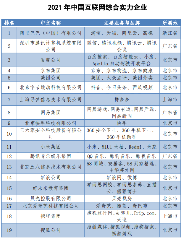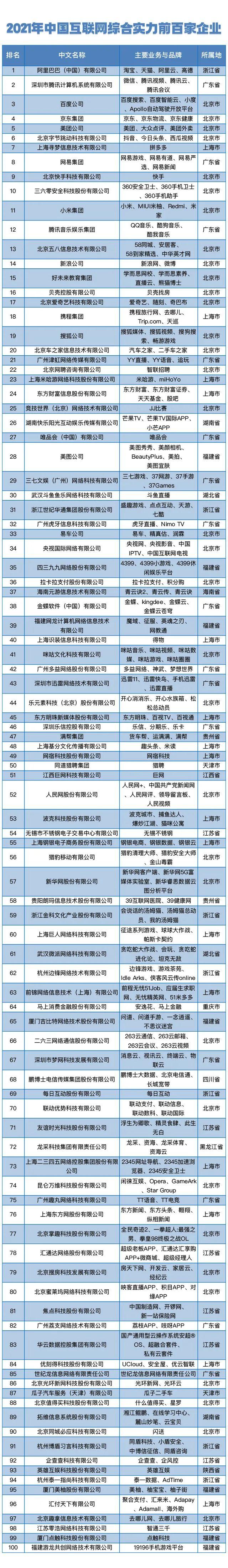 2021年中国互联网综合实力十强企业依次为阿里、腾讯、百度、京东、美团、字节跳动、拼多多、网易、快手、三六零。