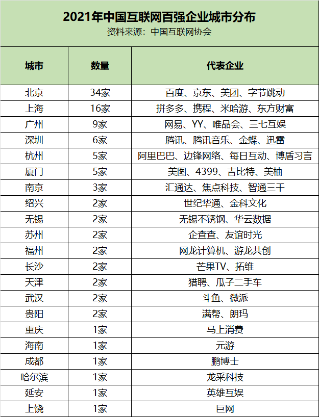 互联网百强企业,北京占据34家,且排名普遍靠前,是妥妥的中国互联网第一城。