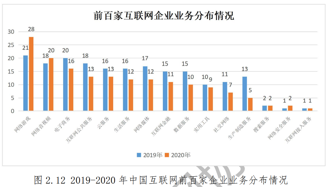 互联网百强企业涉及网络游戏业务的有28家,数量最多,其次是涉及网络音视频的有20家、电子商务16家,互联网公共服务13家、云服务13家。