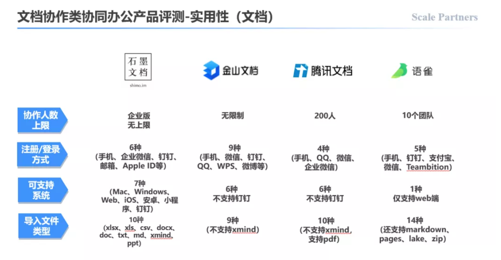 2、 用户侧:「云Office」对应企业和组织场景,即要对一群人大范围的精准传达信息,通过对话达成共识再转化成每个人的任务进行分配,各任务之间互相串联,任务按层级达成推进,这样复杂的逻辑关系,比普通的实时协同对于云端要求更高。不仅如此,石墨对企业中的多个用户进行了文档权限管理,不同层级的用户能够浏览的权限不同,并生成定制化看板,让每个使用者都能够清晰明了;3、 工具侧:除了内容形式的丰富和多层级的用户管理,「云Office」还提供了创新套件,支持内部多产品线的套件互联,比如基于表格创建图表,插入幻灯片,幻灯片的图表内容会随着表格数据的变化而变化,让数据在石墨中保持统一。 肉眼的可见的是,工具的升级使得「云Office」成为了企业中的一个“超级连接器”,它不仅连接了文件与文件、文件与人、人与人之间的关系,更连接和解决了传统Office无法解决的痛点:软硬件之间断层问题。 目前,除了与微软Office、WPS等其他办公软件兼容,石墨在硬件方面支持海光、兆芯等CPU,也针对统信、麒麟等国产Linux操作系统进行了适配,同时,在此前光锥智能与Scale Partners势乘资本联合发布的《2020年中国协同办公行业洞察报告》中有过详细测评,石墨、金山文档不仅常用功能多达36项和28项,与Word的兼容性也更高,能够满足企业日常办公中深度的文档协作需求。