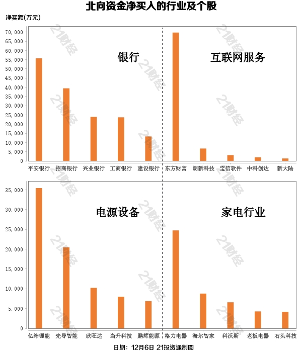据21投资通(微信号ID:touzit21)智能监测,12月6日,北向资金净买入3.95亿元,其中沪股通净买入21.23亿元,深股通净卖出17.28亿元。