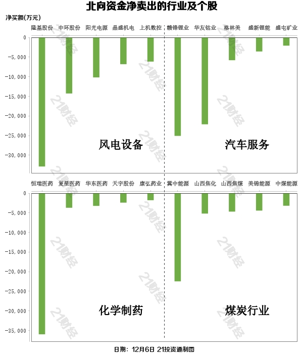 北向资金减持了64个行业,其中风电设备最多,净卖出金额达6.36亿元,其次是汽车服务行业,净卖出4.93亿元。