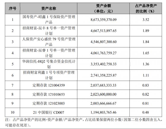 从期末前十项资产上看,产品持有6笔资产管理计划、3笔定期存款和1笔大额存单,所投资管计划包括保险资管、基金专户、资金信托计划等。其中,资管计划中有半数为是招商财富资产管理有限公司设立的基金专户产品。