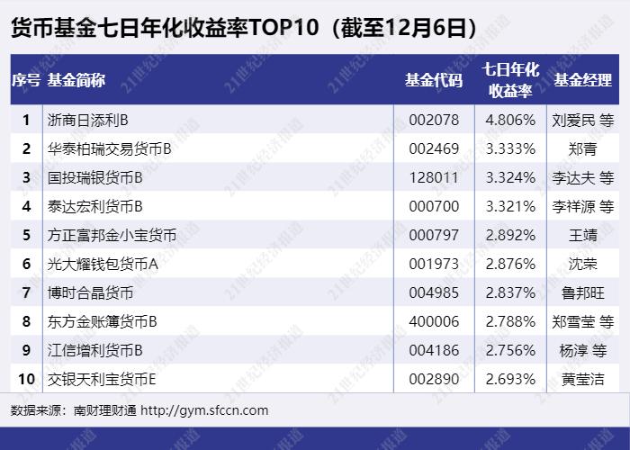 为深度分析银行的现金管理类理财产品,课题组选取了货币基金进行对比。截至12月6日,有三只货币基金七日年化收益率超过3%,分别为“浙商日添利B”、“华泰柏瑞交易货币B”、“国投瑞银货币B”。