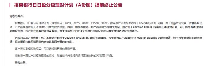 随着资管新规过渡期即将于年底结束,个别不合规的老产品已陆续提前终止,比如招商银行另一款现金管理类产品“日日盈分级理财计划”已于去年11月26日提前终止,招行公告提前终止的原因为:由于金融市场发展、资管新规出台,产品继续运作将无法保障投资者的投资收益。