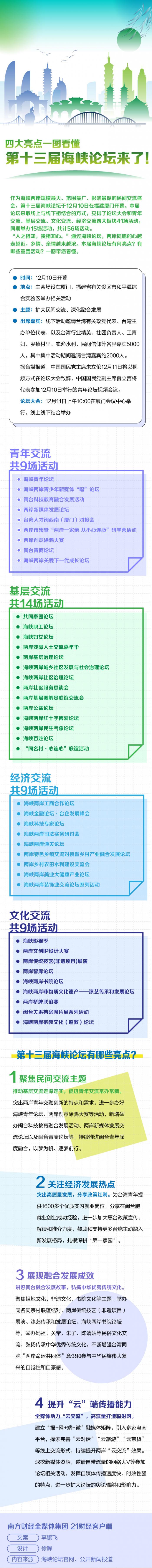 作为海峡两岸规模最大、范围最广、影响最深的民间交流盛会,第十三届海峡论坛于12月10日在福建厦门开幕。本届海峡论坛有何亮点?有哪些重要活动?一图带您看懂。