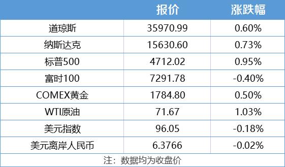 1、美股三大指数集体收涨,纳指涨0.73%;标普500指数涨0.95%,创历史收盘新高;道指涨0.6%。