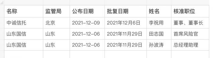 上周,以银保监官网公布日期为口径,有2家信托公司的董监高任职资格获批。包括:中诚信托董事长李祝用,山东国信总经理助理孙波涛、首席风险官田志国。
