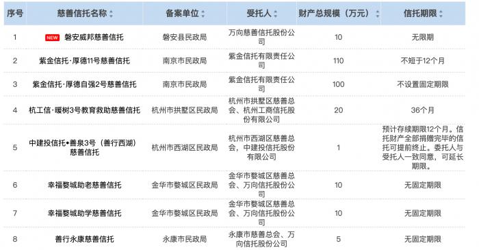 1、上周共有8只慈善信托成功备案并公示