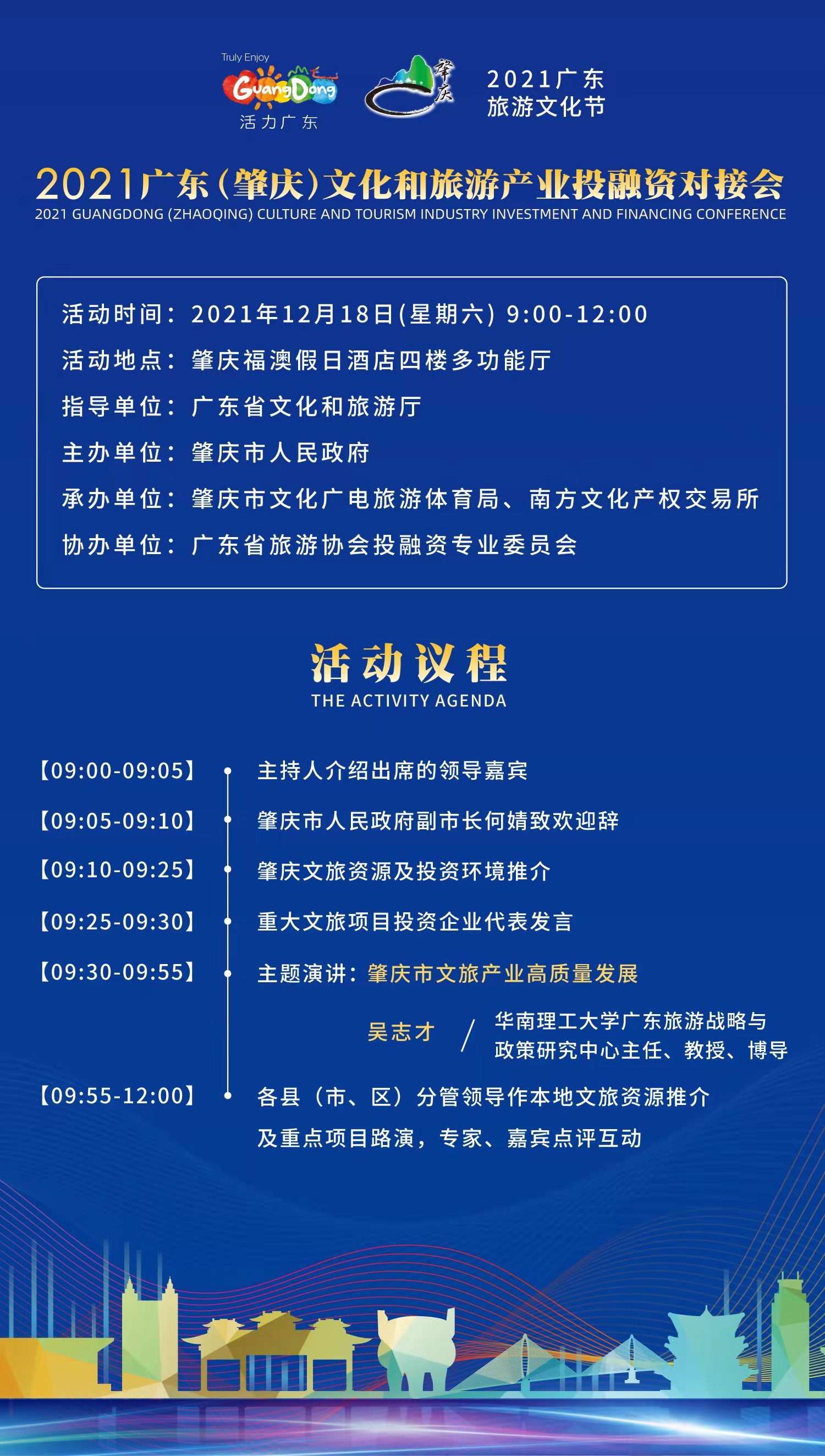 肇庆是粤港澳大湾区重要节点城市,是“广佛肇经济圈”、珠江-西江经济带重要组成部分,是经济发达地区通往西南各省的重要交通枢纽。为扩大肇庆在文旅业界的影响,加快肇庆文旅产业高质量发展,肇庆市人民政府以举办2021广东旅游文化节为契机,拟于12月18日上午在肇庆福澳假日酒店举办2021广东(肇庆)文化和旅游产业投融资对接会,邀请文旅行业主管部门、文旅企业和投资集团、产业基金、风险投资公司、银行、券商等参加,共同聚焦探讨肇庆文旅产业发展新态势、新挑战、新机遇。