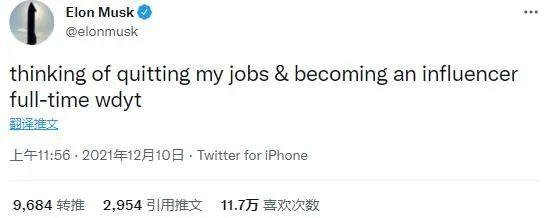 这源于他最新的一则动态——12月10日晚,马斯克在社交媒体上表示,“我正在考虑辞去我的工作,全职做一个意见领袖(influencer)。你们觉得呢?”这番言论在全球引发热议,甚至有网友调侃:地球已经容不下他了?