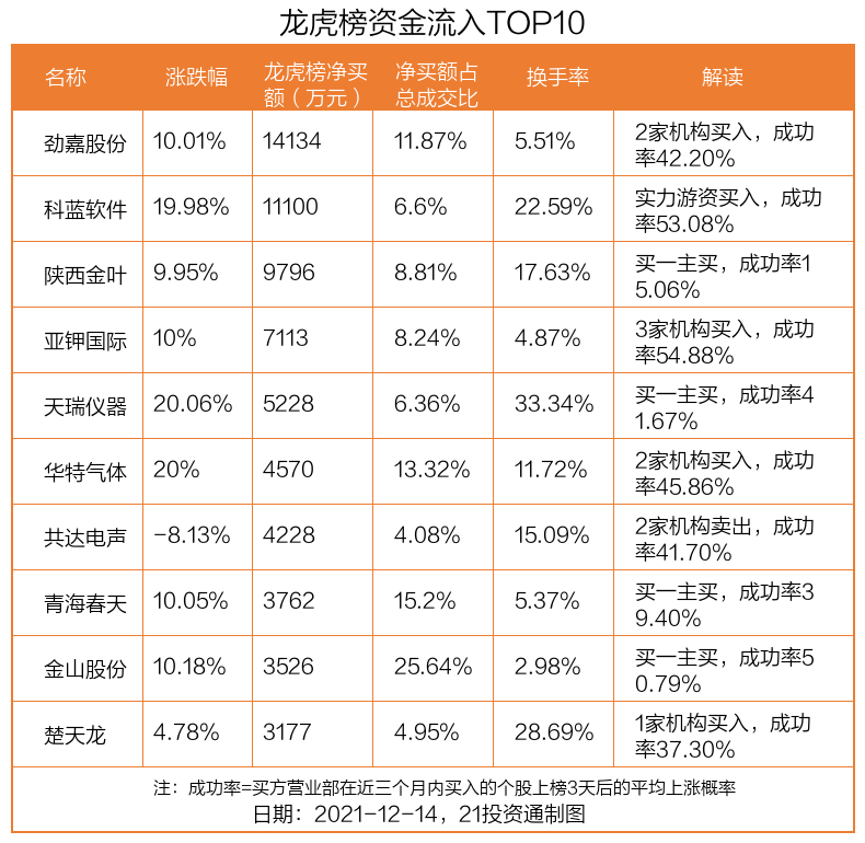 12月14日,上证指数下跌0.53%,深证成指下跌0.5%,创业板指下跌0.05%。烟草概念股强势拉升,盘后龙虎榜数据显示,共有42只个股因当日异动登上龙虎榜,资金净流入最多的是烟草概念股劲嘉股份(002191.SZ),达1.41亿元,当日收盘涨停,机构和北向资金共同抢筹,合计金额逾亿元。