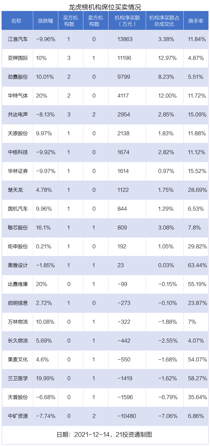 其中,机构净买入金额最多的是江淮汽车(600418.SH),当日收盘下跌9.96%,换手率为11.84%。
