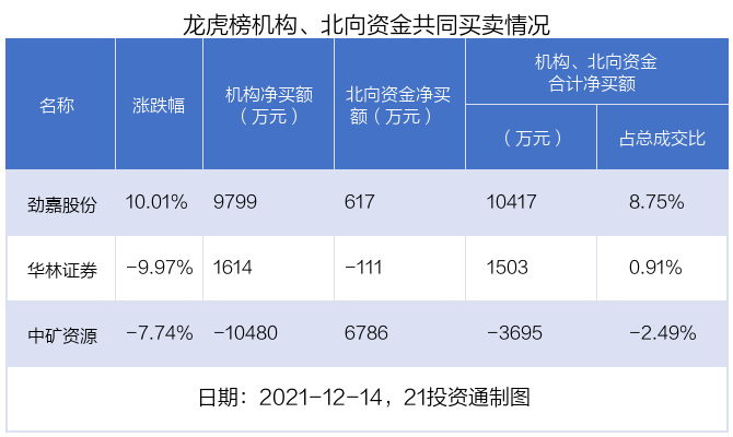 值得注意的是,机构和北向资金共同净买入了劲嘉股份;在中矿资源,华林证券上出现分歧,机构净卖出中矿资源1.05亿元,北向资金净买入6785.73万元;机构净买入华林证券1614.06万元,北向资金净卖出110.65万元。
