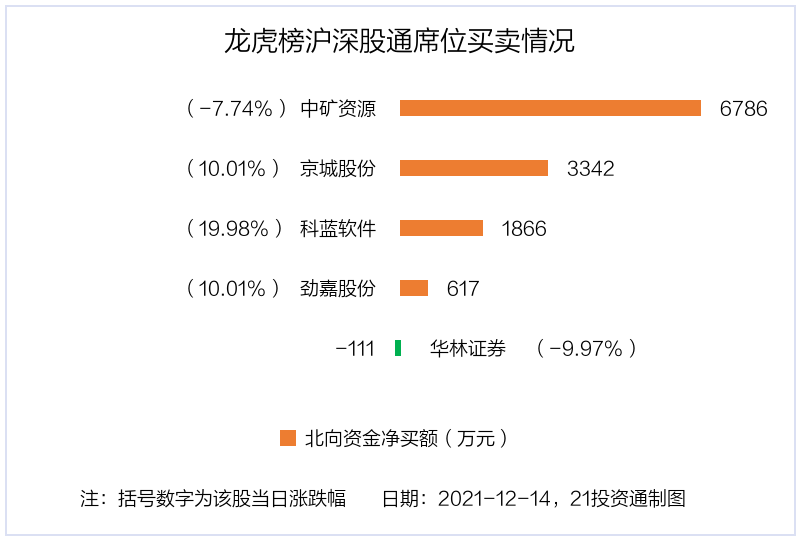 12月14日,北向资金参与龙虎榜中的个股共有5只,合计净买入1.25亿元。其中沪股通净买入1 股,金额为3342.43万元;深股通净买入3 股,净卖出1 股,合计净买入9158.04万元。
