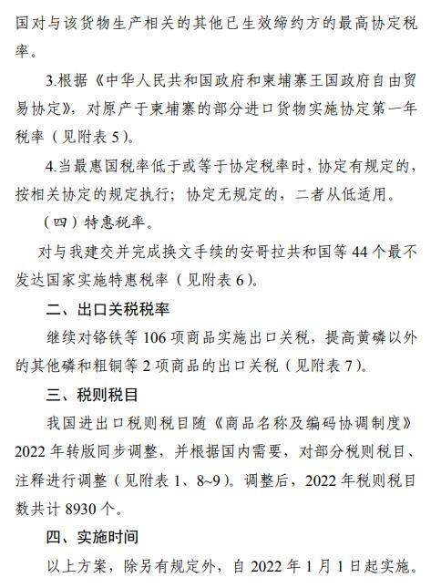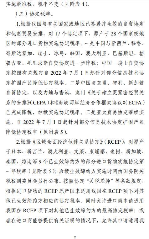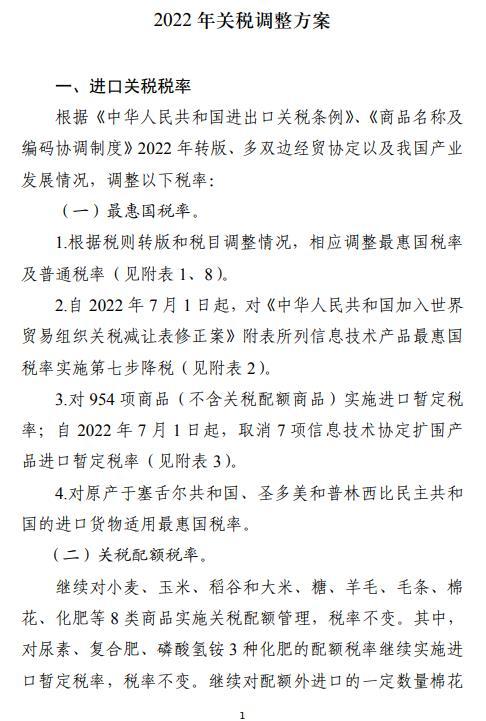 国务院关税税则委员会发布2022年关税调整方案。对954项商品(不含关税配额商品)实施进口暂定税率;自2022年7月1日起,取消7项信息技术协定扩围产品进口暂定税率。继续对小麦、玉米、稻谷和大米、糖、羊毛、毛条、棉花、化肥等8类商品实施关税配额管理,税率不变。其中,对尿素、复合肥、磷酸氢铵3种化肥的配额税率继续实施进口暂定税率,税率不变。继续对配额外进口的一定数量棉花实施滑准税,税率不变。