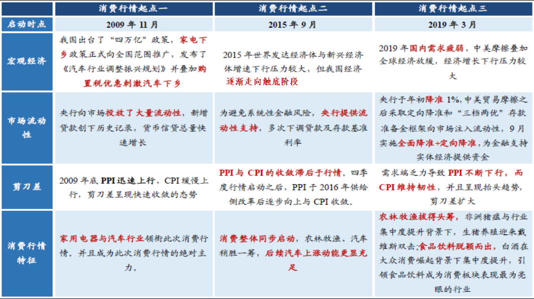 回顾历史上三轮消费行情的起点(2009.11/2015.9/2019.3),存在三大共同特征。
