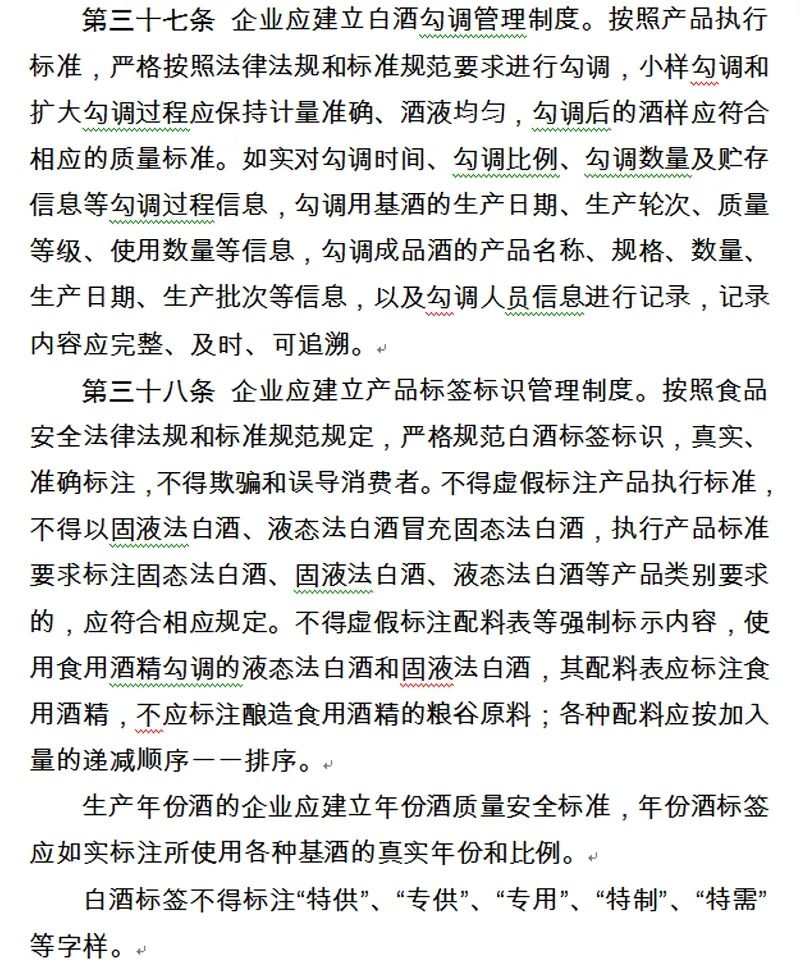 在产品标签标识管理制度方面,《征求意见稿》指出,白酒企业应建立产品标签标识管理制度。白酒企业须按照食品安全法律法规和标准规范的规定,严格规范白酒标签标识,真实、准确标注,不得欺骗和误导消费者;不得虚假标注产品执行标准,不得以固液法白酒、液态法白酒冒充固态法白酒,执行产品标准要求标注固态法白酒、固液法白酒、液态法白酒等产品类别要求的,应符合相应规定;不得虚假标注配料表等强制标示内容,使用食用酒精勾调的液态法白酒和固液法白酒,其配料表应标注食用酒精,不应标注酿造食用酒精的粮谷原料,各种配料应按加入量的递减顺序一一排序。