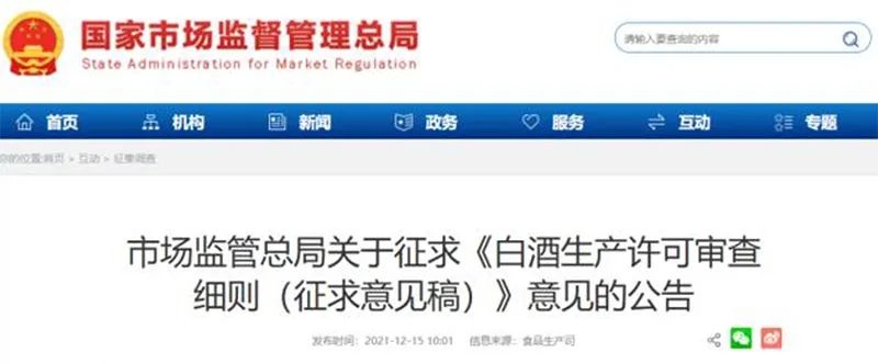 消息面上,国家市场监督管理总局昨日发布公告称,为规范指导白酒生产许可工作,加强白酒质量安全监管,市场监管总局组织起草了《白酒生产许可审查细则(征求意见稿)》(下称《征求意见稿》),并向社会公开征求意见。