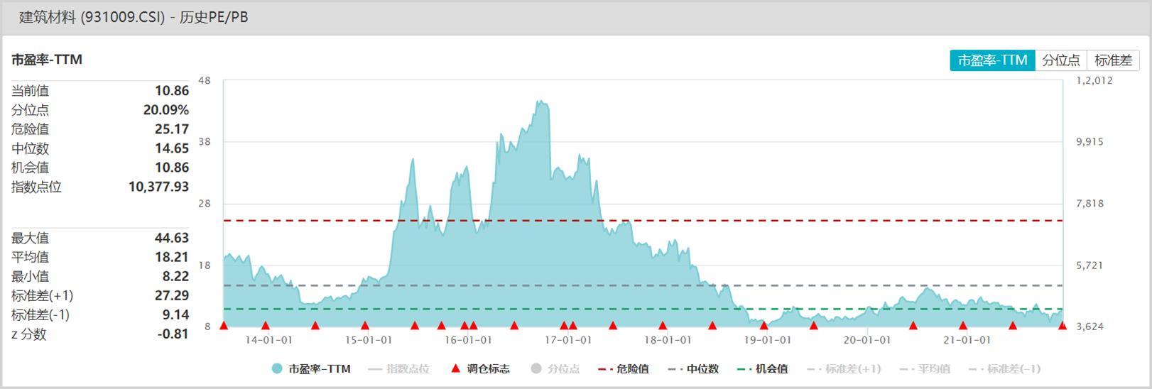 建材跟地产休戚相关,地产行业严调控的阵阵寒风,也令建材板块持续回调。中证建筑材料(931009.CSI)指数自年内高点至今下滑超10%,市盈率(TTM)被打到不足11倍,处于历史低谷期。