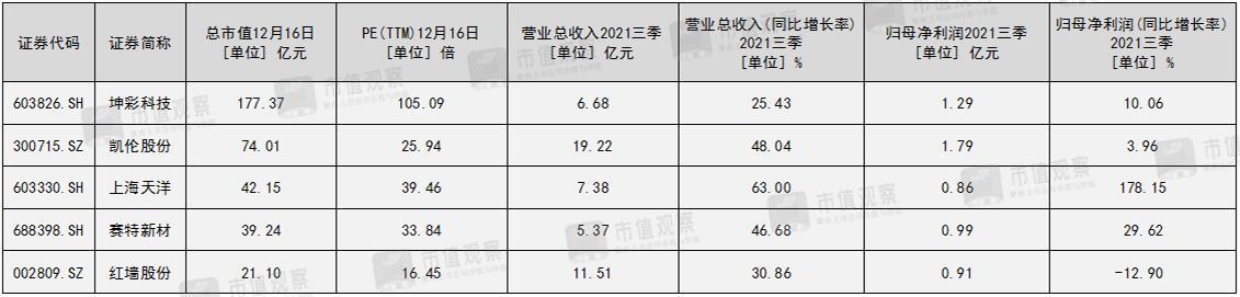 估值层面来看,五虎中除了坤彩科技PE超过百倍外,其余企业估值相对合理。