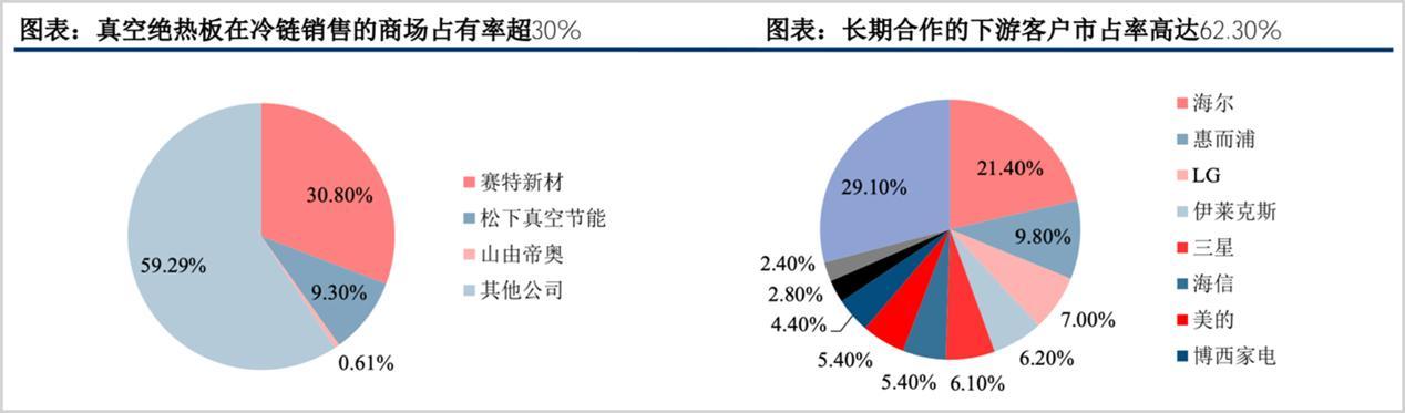 赛特新材是真空绝热板行业的绝对龙头,市占率超过30%,是第二名松下的3倍还多。2020年在科创板上市,公司业务十分聚焦,绝缘板收入占比超过96%,下游主要应用于保温(冰箱、冷柜)和冷链物流(医用及食品保温箱、自动贩卖机等)领域。