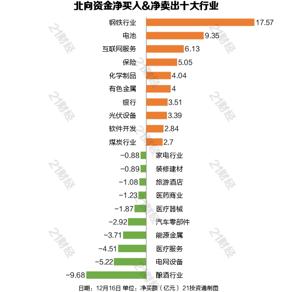 从净买入金额来看,北向资金增持了72个行业,其中钢铁行业居首,净买入金额达17.57亿元;减持了28个行业,其中酿酒行业最多,净卖出金额达9.68亿元。