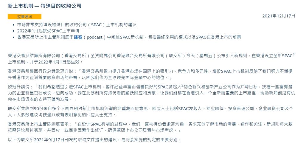 香港交易及结算所有限公司(香港交易所)全资附属公司香港联合交易所有限公司(联交所)今天(星期五)公布引入新规则,在香港设立全新SPAC上市机制,并于2022年1月1日起生效。