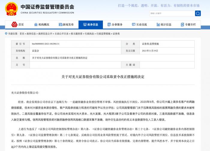 2020年9月,光大证券大幅上调多名客户的两融授信额度,但未对大额资金来源合理性、客户风险承担能力和违约可能性予以充分评估;公司风险管理部门关于压降高风险标的股票两融负债的要求未被有效执行,由于融资融券业务授信管理不审慎、风控措施执行不到位等违规行为,被证监会要求责令改正。