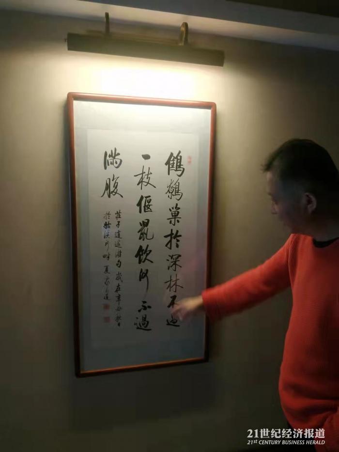 (图说:沈东军解释他家墙上的名家书法作品及其内涵。21世纪经济报道记者 王海平 拍摄)