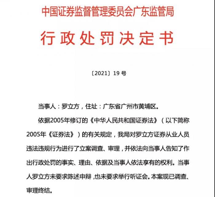处罚书显示,当事人罗某方为证券从业人员。2012年4月18日至2018年11月28日,罗某方在中国中投证券有限责任公司广州开创大道北证券营业部(现中国中金财富证券有限公司广州开创大道北营业部,以下简称营业部)担任客户经理。