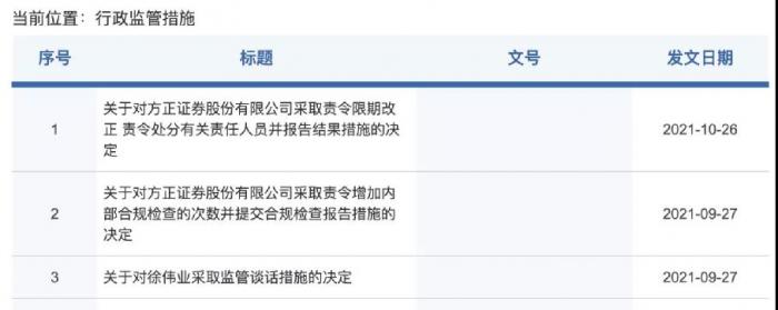 除此之外,方正证券因未能严格规范工作人员执业行为,未能及时发现并采取有效措施予以纠正等问题,湖南证监局对其采取责令增加内部合规检查的次数并提交合规检查报告措施的决定。
