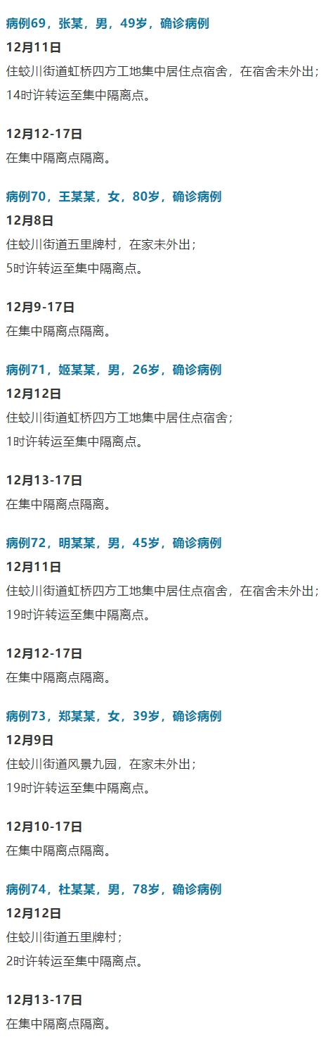 自12月5日以来,截至12月18日16时,宁波累计报告确诊病例74例。刚刚,浙江省宁波市公布了确诊病例69—74的活动轨迹,具体内容如下: