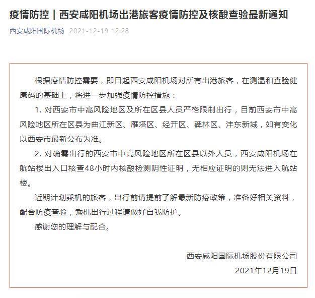 咸阳机场:对西安市中高风险地区及所在区县人员严格限制出行
