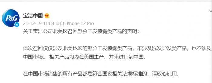 12月19日,宝洁中国在官方微博发布关于宝洁公司北美区召回部分干发喷雾类产品的声明。声明中指出,此次召回仅仅涉及北美地区的部分干发喷雾类产品,不涉及洗发护发类产品,也不涉及中国市场。 相关产品均为在美国生产,并未进口到中国。在中国市场销售的所有产品都是符合国家相关法规标准的,请放心使用。