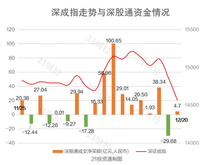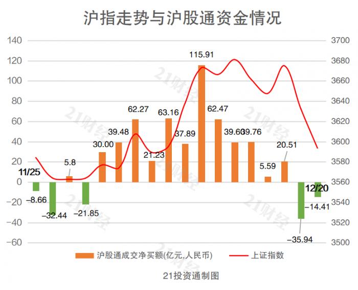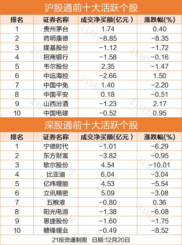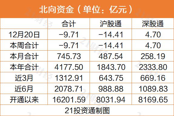 据21投资通(微信号ID:touzit21)智能监测,12月20日,北向资金净卖出9.71亿元,其中沪股通净卖出14.41亿元,深股通净买入4.07亿元。