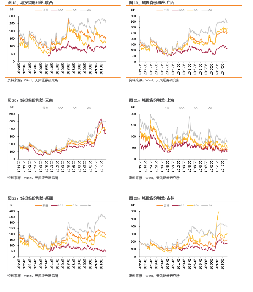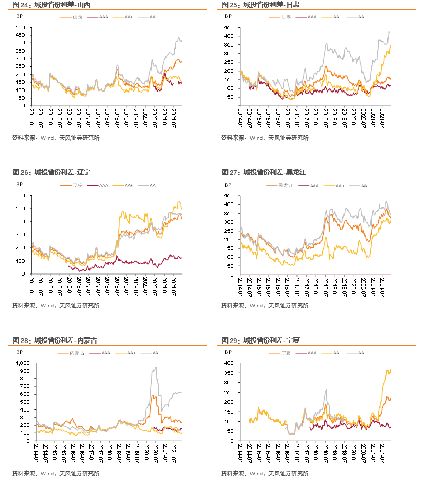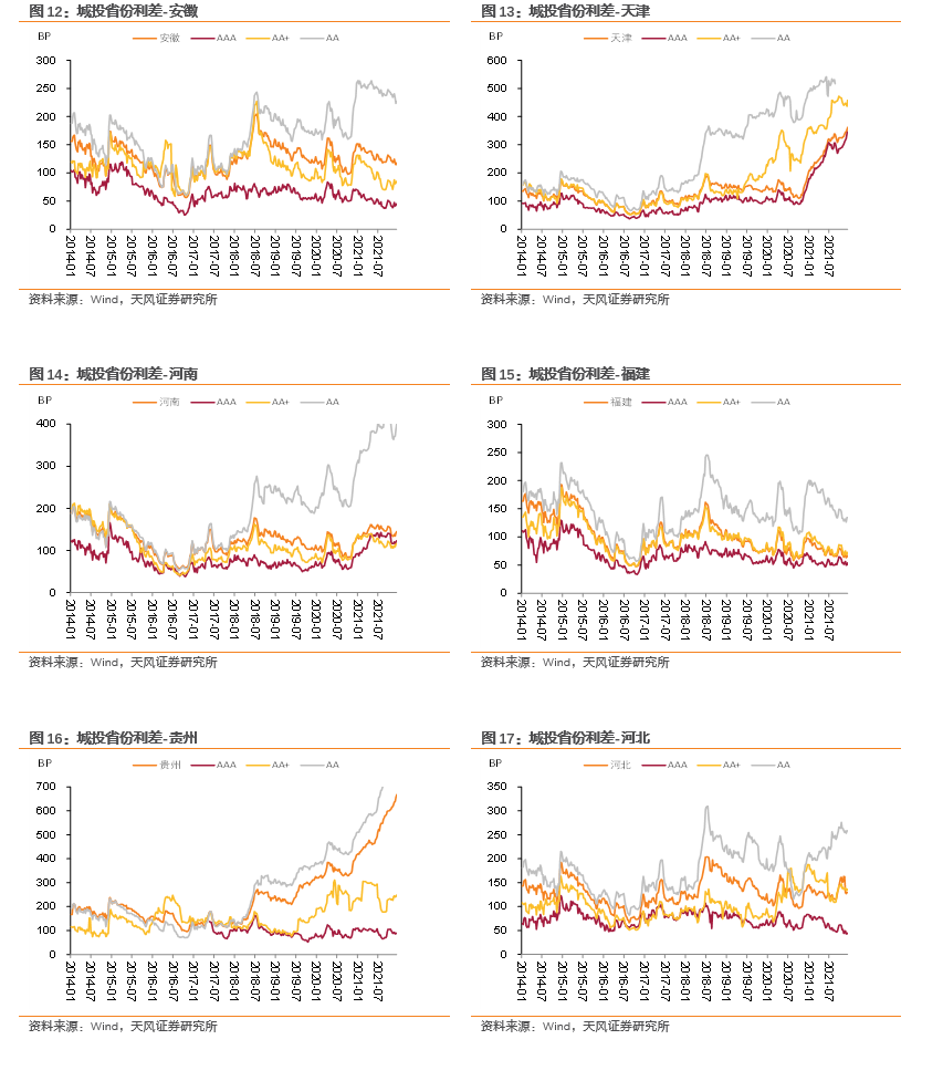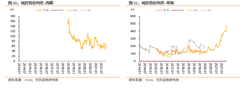 分省份来看,利差下行幅度最大的省份为宁夏(-2.05bp)、河北(-0.02bp),利差上行幅度最大的省份为西藏(18.22bp)、青海(13.01bp)、贵州(12.38bp)、天津(8.98bp)、重庆(7.67bp)。