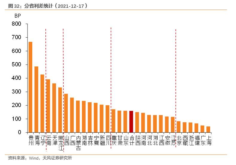 第二梯队(300-400bp):云南(392.16bp)、天津(361.68bp)、黑龙江(331.83bp);