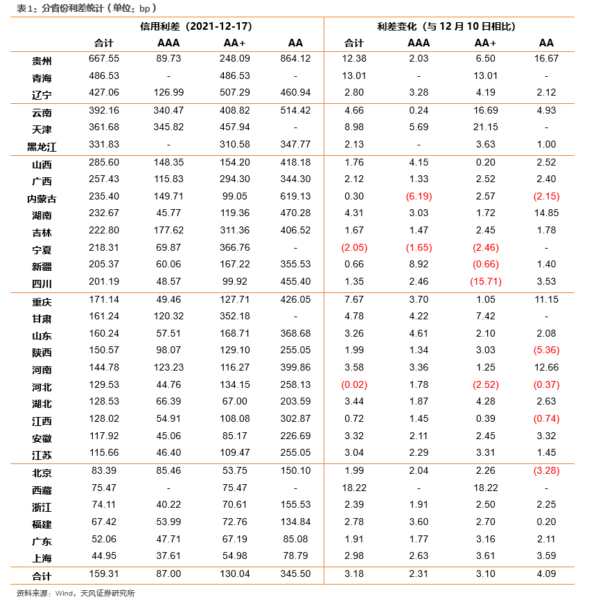 第一梯队(400bp以上):贵州(667.55bp)、青海(486.53bp)、辽宁(427.06bp);