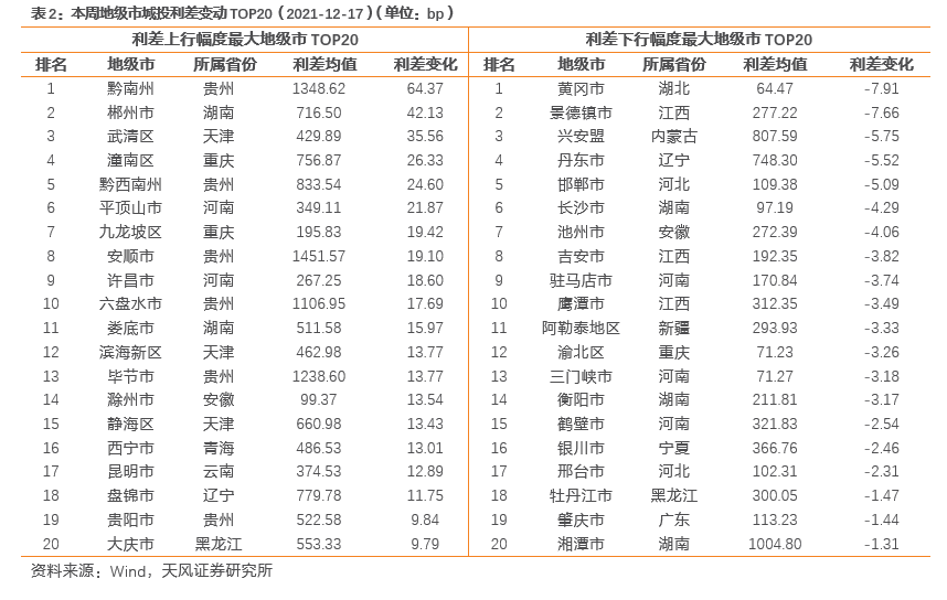 12月17日,与12月10日相比,城投债信用利差上行幅度最大的地级市为贵州黔南州、湖南郴州市、天津武清区、重庆潼南区、贵州黔西南州、河南平顶山市、重庆九龙坡区、贵州安顺市、河南许昌市、贵州六盘水市,城投债信用利差下行幅度最大的地级市为湖北黄冈市、江西景德镇市、内蒙古兴安盟、辽宁丹东市、河北邯郸市、湖南长沙市、安徽池州市、江西吉安市、河南驻马店市、江西鹰潭市。